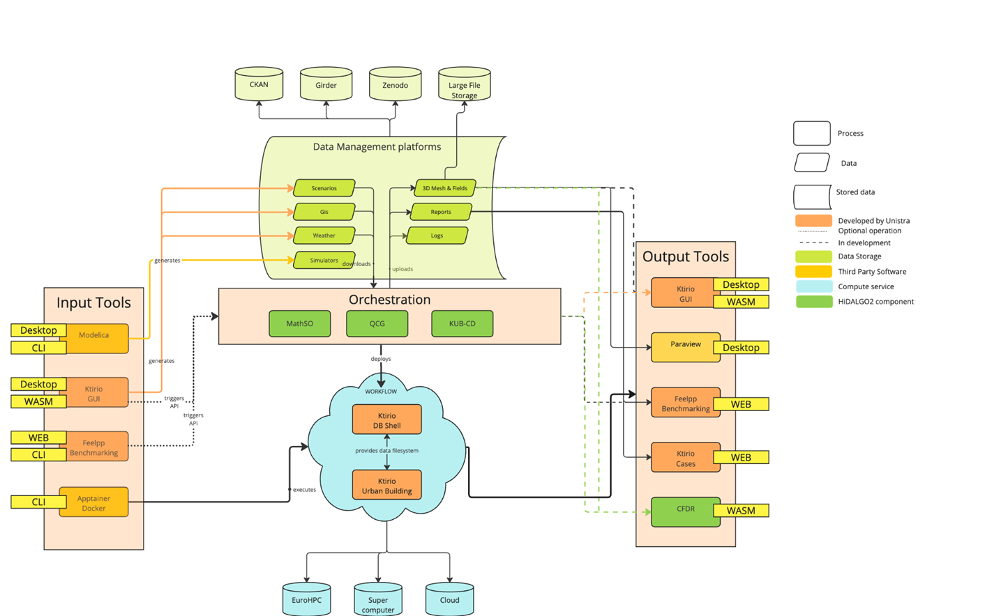 The Ktirio Urban Building application, a pilot of the CoE HIDALGO2, is structured into a sophisticated software architecture leveraging multiple input and output tools, data management platforms, orchestration layers, and computational infrastructures.
